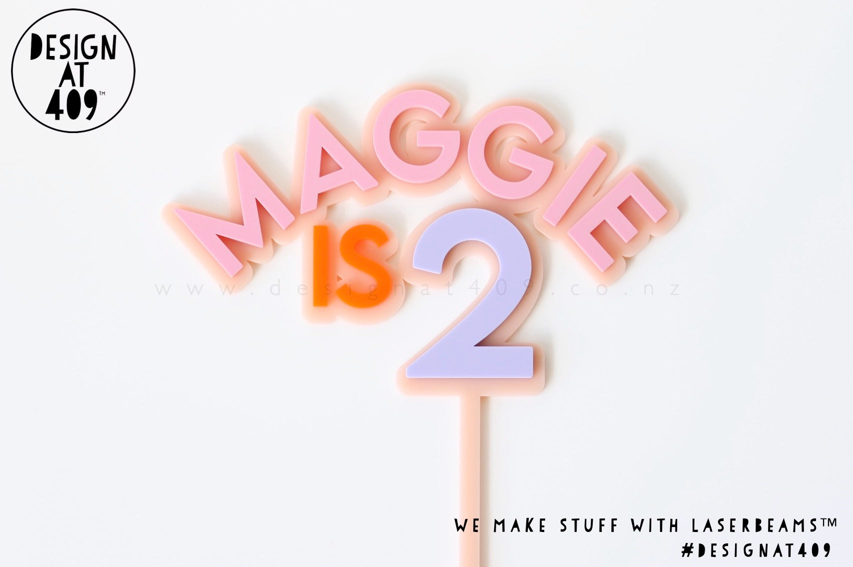 Custom Arched Name With Custom Age Topper with a drop shadow. These are layered, so any colour background acrylic and then your choice of name colour an d is and number on the front. Can be cut in any colour/materials available in the drop down material options.