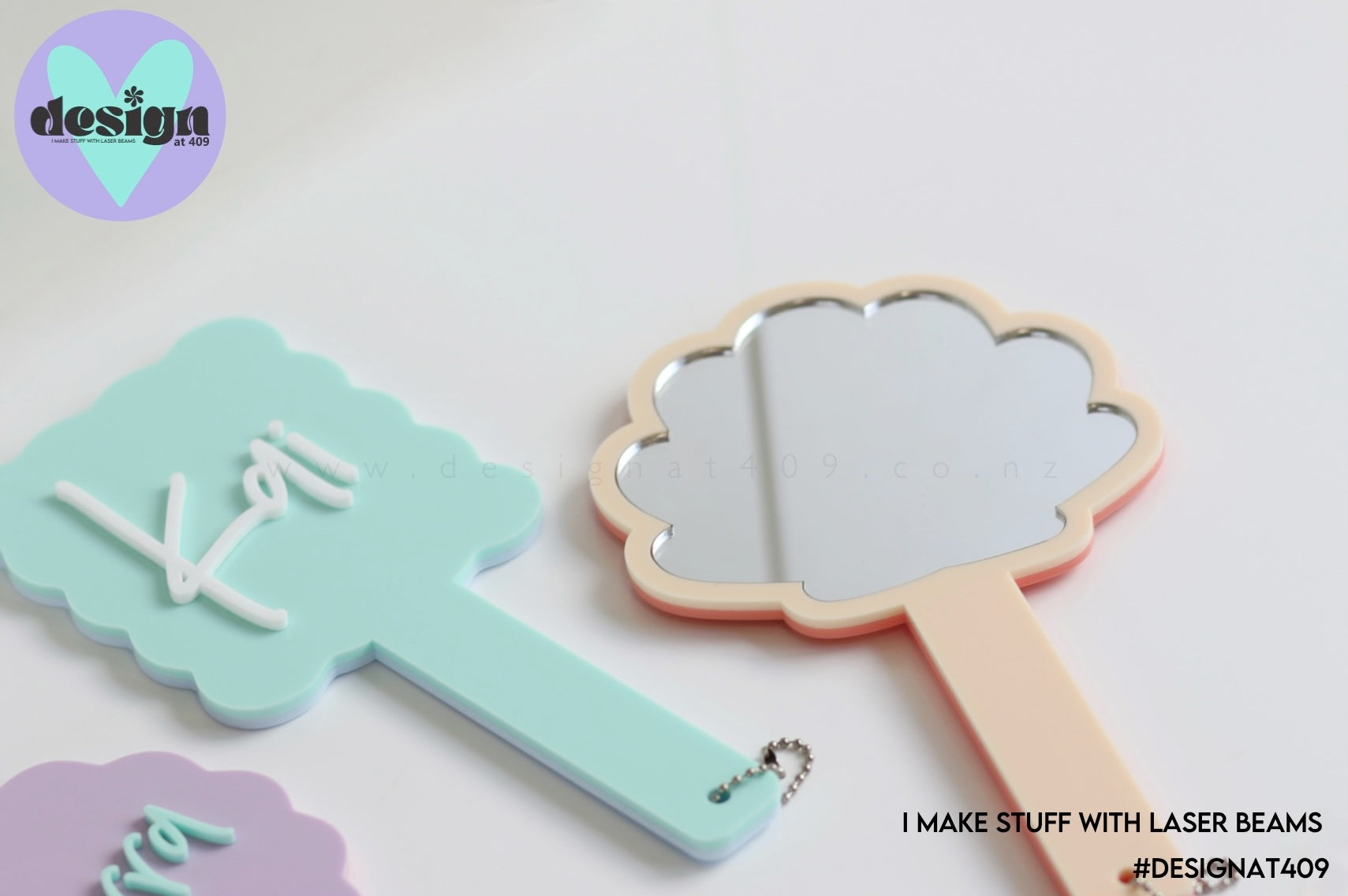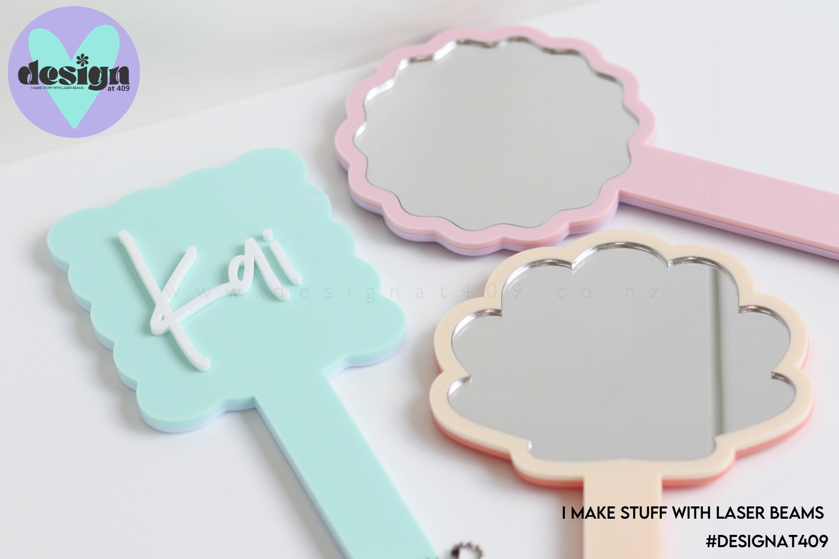 The most super cute customised handheld mirrors! Available in 4 shapes in your fave candy colours! You can choose a back colour, front colour and name colour.